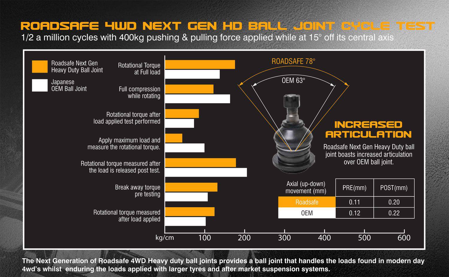 The Next Generation of Roadsafe 4WD Heavy Duty ball joints provides a component that handles the loads found in modern day 4WD’s whilst enduring the loads applied with larger tyres and aftermarket suspension systems.